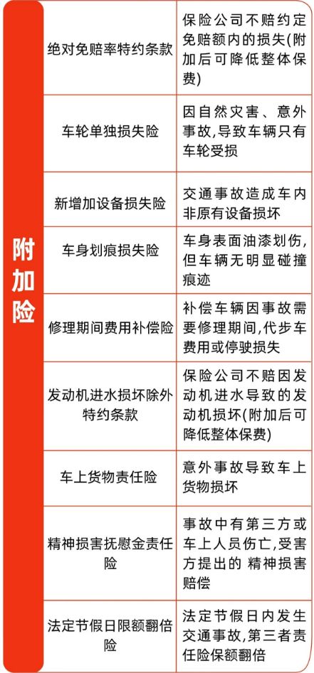 三大主险:三者险、车损险、座位险;11个附加险